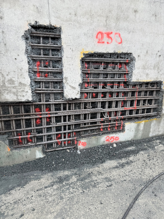 The HPWJ robot is the only solution capable of achieving such highly specific and complex cutouts without damaging underlying reinforcement. Traditional methods, such as jackhammers or saw cutting would damage the reinforcement and fail to achieve such precise consistent cut depths. With the HPWJ system, we were able to work with great precision, efficiently removing the compromised concrete without compromising the wall’s integrity. The entire process was completed efficiently, and without any unintended consequences, ensuring the repair was both effective and precise.