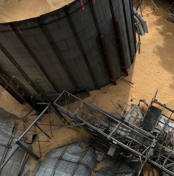 Silver Raven was engaged by Illawarra Engineering and arrived onsite 8 hours after initial contact, to execute emergency high-risk cold-cutting operations in response to the Manildra silo collapse in Nowra. The situation posed significant challenges due to the flammable nature of spilled grain and the proximity of flour silos, ruling out traditional cutting methods. The focus was on safely removing two critical structural members—large walkways and stairways still attached to the unstable silo structure.