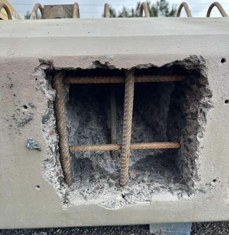 Accurate alignment of these bolt sets was essential. However, several sets were discovered to be misaligned, both in parapets already installed on the bridge and in pre-cast units still located in staging yards. Traditional concrete demolition methods were ruled out due to the risk of overbreak and structural compromise. As a result, Silver Raven was contracted to perform precision hydro demolition to remove the bolt sets without damaging the surrounding concrete.